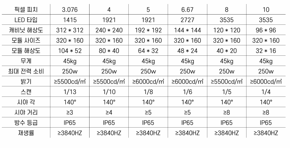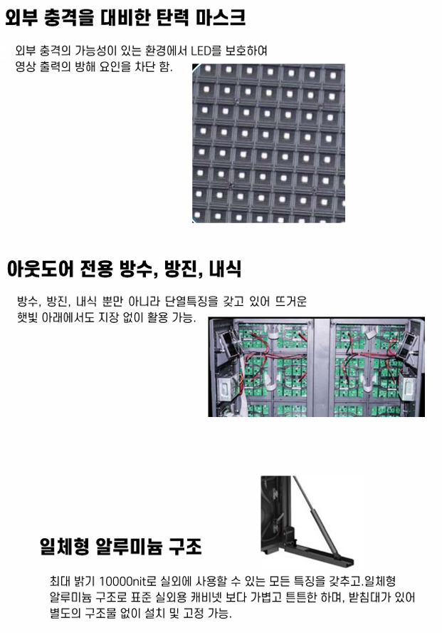 최대 밝기 10000nit로 실외에 사용할 수 있는 모든 특징을 갖추고.일체형 알루미늄 구조로 표준 실외용 캐비넷 보다 가볍고 튼튼한 하며, 받침대가 있어 별도의 구조물 없이 설치 및 고정 가능.