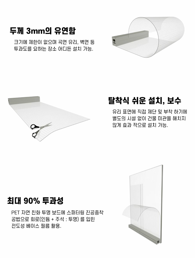크기에 제한이 없으며 곡면 유리, 벽면 등 투과도를 요하는 장소 어디든 설치 가능.