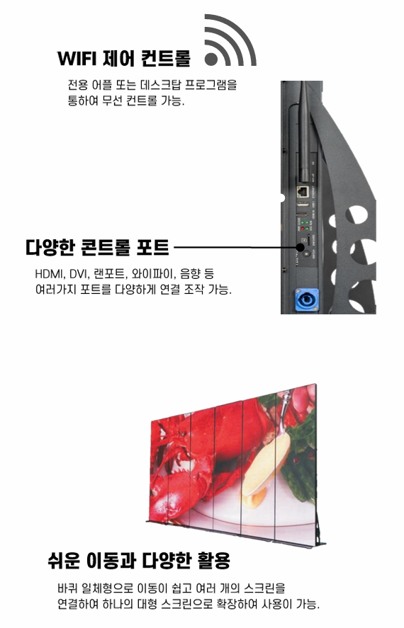 바퀴 일체형으로 이동이 쉽고 여러 개의 스크린을 연결하여 하나의 대형 스크린으로 확장하여 사용이 가능.