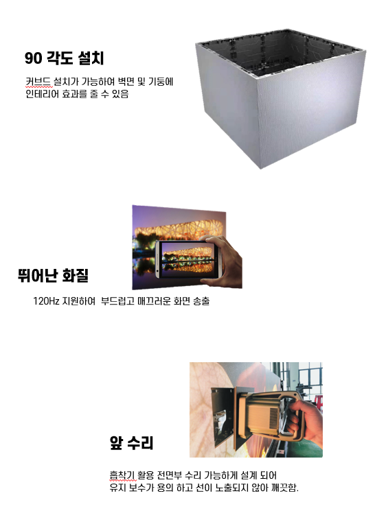 흡착기 활용 전면부 수리 가능하게 설계 되어 유지 보수가 용의 하고 선이 노출되지 않아 깨끗함.